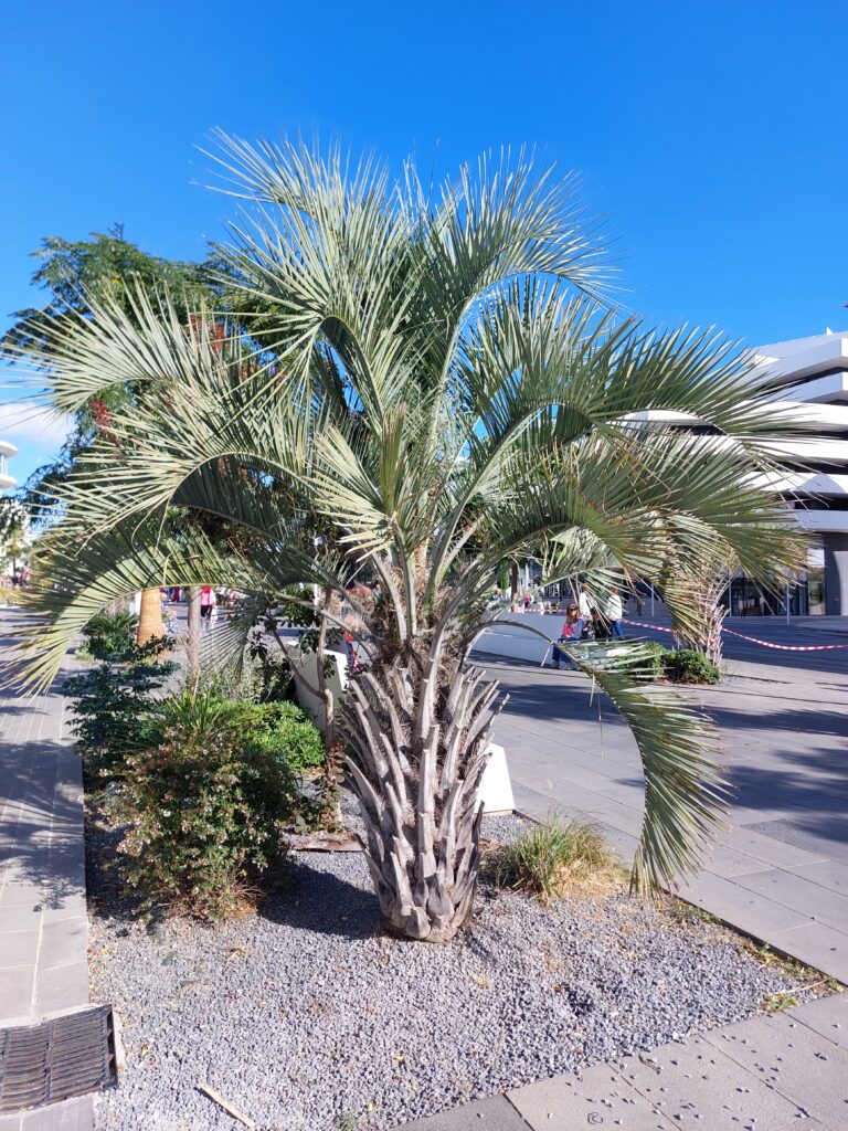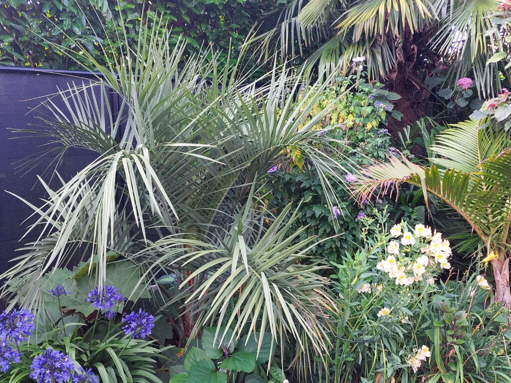 Deze tuin blinkt uit met veel prachtige palmen, zoals deze Butia capitata.