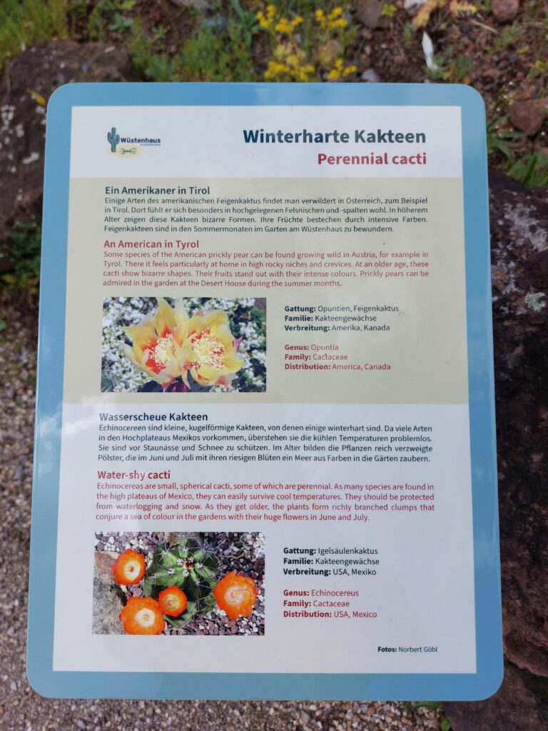 Er is heel wat informatie over de planten die je hier aantreft.Cactussen en andere succulenten in de tuin van het Palmenhaus in Wenen.