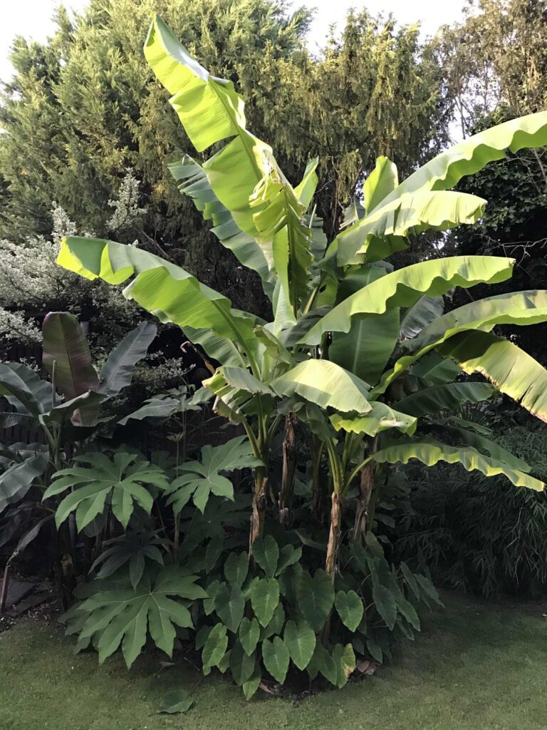 Exotentuin met winterharde palmen, bananen, vijgen, druiven, een kraakhelder vijvertje, veel Colocasia’s en Alocasia’s, een Albizia, heel veel canna’s, siergembers, Fuchsia’s, Yucca rostrata, enz.